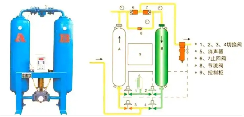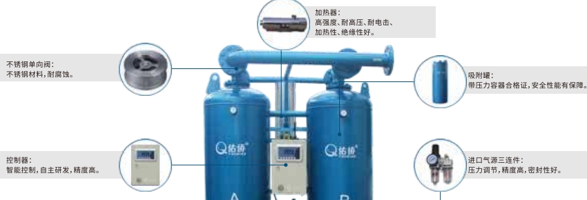 吸附式干燥机的主要结构包括吸附塔、吸附剂、控制系统和热源设备等部分。其中,吸附塔是干燥机的核心部件,其内部填充了吸附剂,用于吸附空气中的水分。控制系统负责监控和调节干燥机的运行状态,确保其高效、稳定地工作。热源设备则为干燥机提供所需的热量,促进吸附剂的再生和干燥效果的实现。通过这些部件的协同作用,吸附式干燥机能够有效地去除压缩空气中的水分,提供干燥的压缩空气。